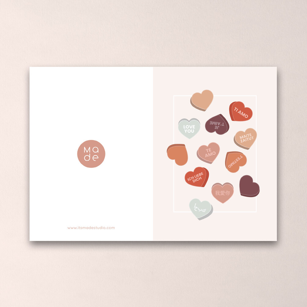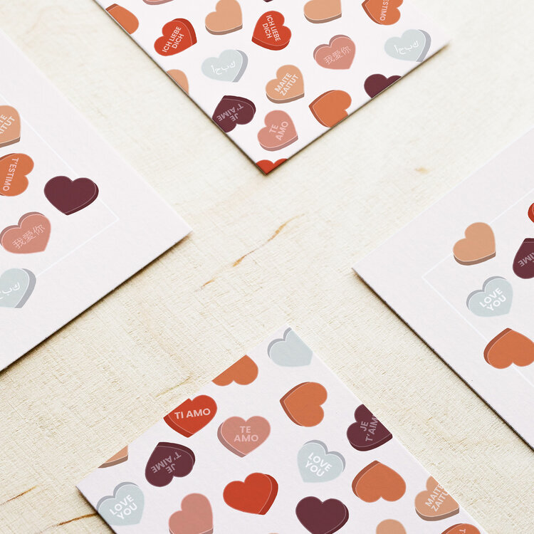 Pack de 2 tarjetas Love para sorprender a esa persona tan especial en el día internacional del amor y la amistad. Ilustración de corazones para decir te quiero en un montón de idiomas.
