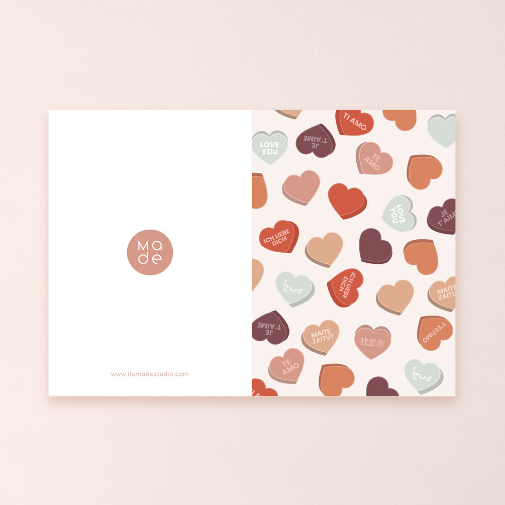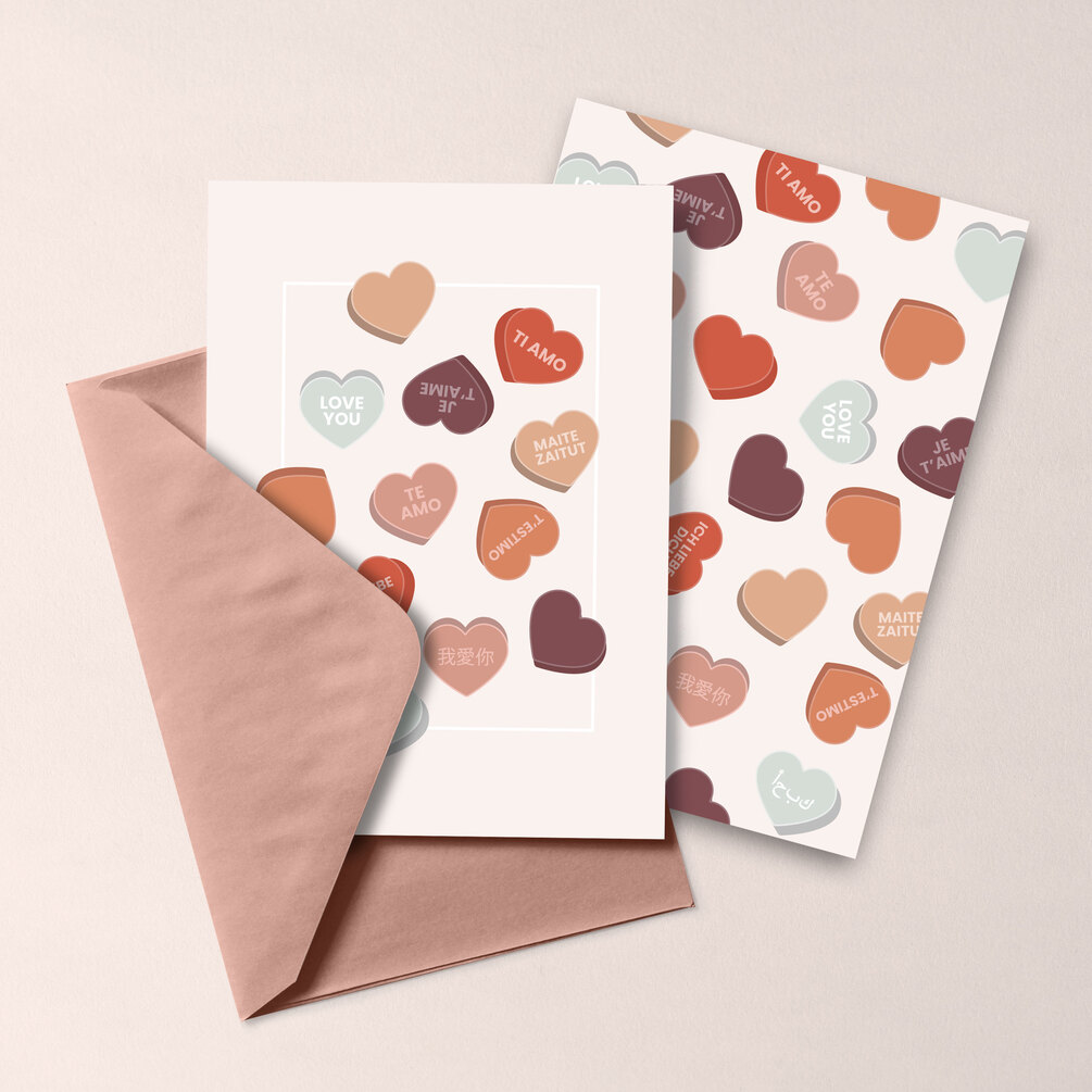 Pack de 2 tarjetas Love para sorprender a esa persona tan especial en el día internacional del amor y la amistad. Ilustración de corazones para decir te quiero en un montón de idiomas.